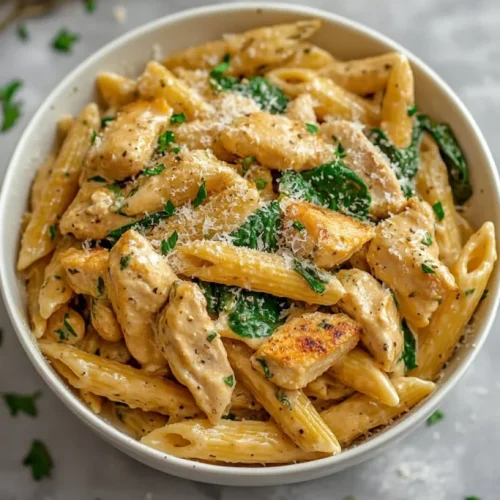 - Combine and finish: Return chicken to the pan along with cooked pasta and baby spinach. Toss until spinach wilts and everything is evenly coated. Reheat gently if needed — do not boil.
